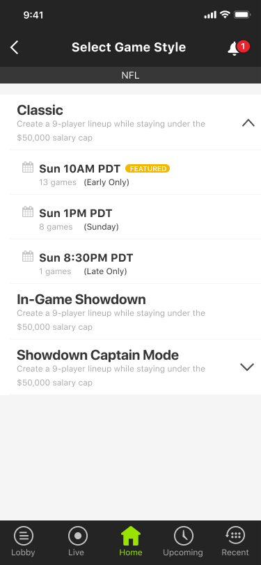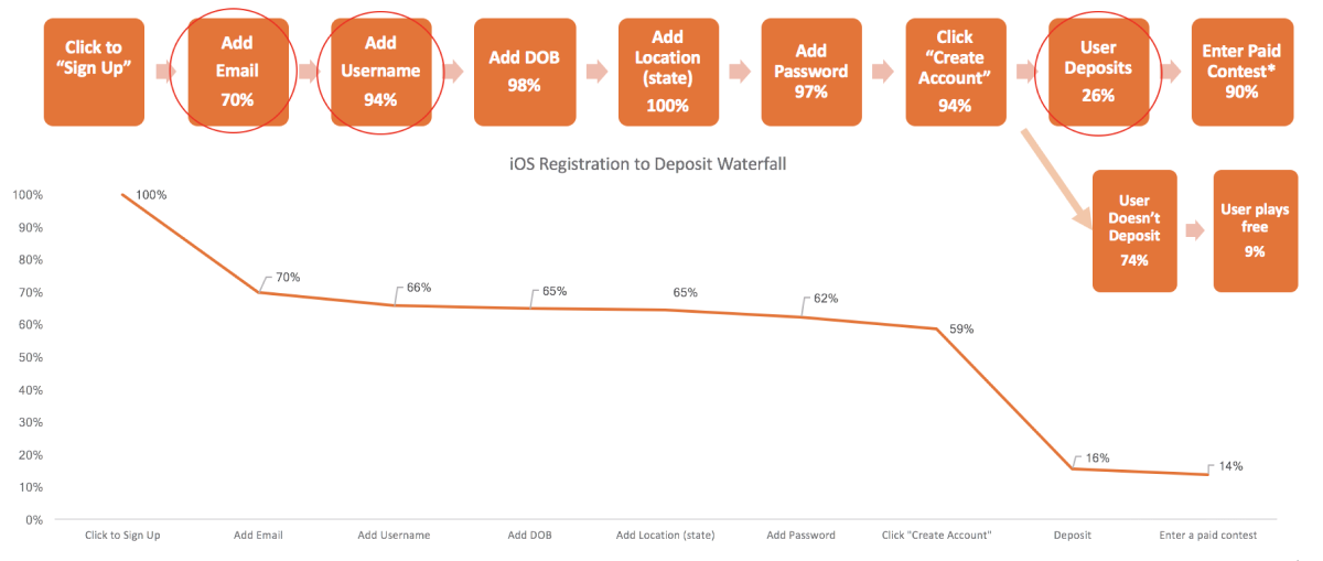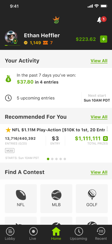 I was presented with data (the graph below) that showed 86% of DraftKings users never entered a paid contest the first time they used the app. We wanted to redesign the first time user experience (FTUX) to increase that number by 25%. I user tested the current flow, identified the pain points, then redesign the flow to fix those issues, did another round of user research to determine if users entering paid contests increased.