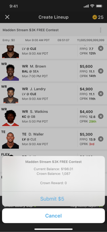 Moved deposit till after lineup submission. The user is now educated about the product, know where their money is going, and have understanding of how the contest/lineup process work. Now that the user knows all these things, we're in a better position to ask you to deposit money to enter this lineup into other contests.