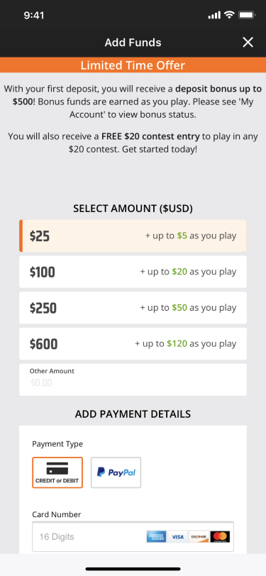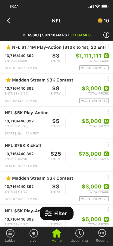 User research of the redesigned flow was very positive. A/B testing of the updates to the flow was tested with 10% of new users and had a 39% increase in users staying in the flow. After this promising data we felt comfortable enough to roll it out to all new users. After 2 months we saw a 31% increase is users staying in the flow and entering a paid contest. Our goal was to increase by at least 25% so 31% is considered a big win. This project was a really amazing learning experience for me and the rest of my team and I'm very happy with how it turned out.