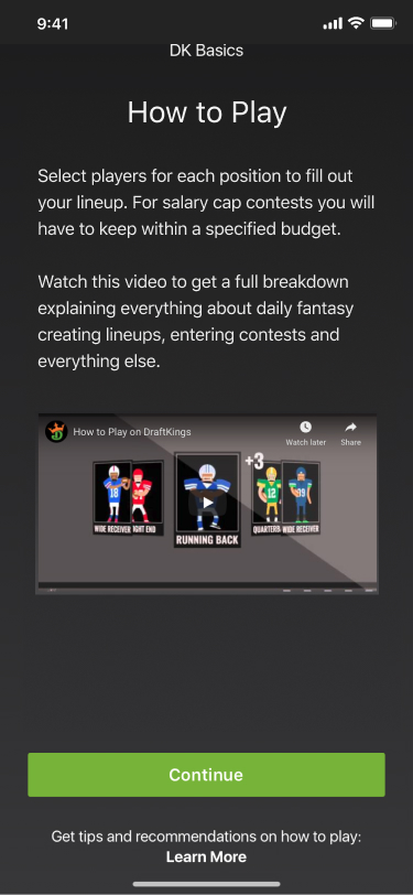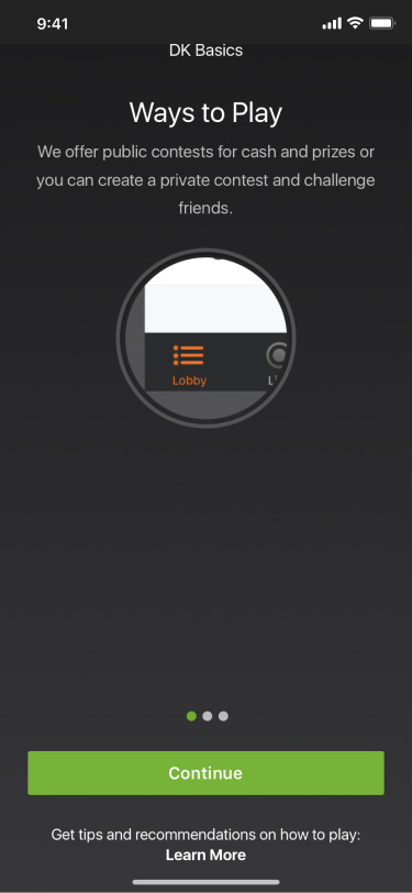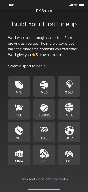Gamified joining your first contest. Users will earn crowns as they build their lineup for the sport of their choosing. We use crowns in our rewards program, you can use them to enter contests instead of cash. When they finish their lineup they will have enough crowns to enter a contest for free. We're giving you something before we ask you for something.
